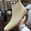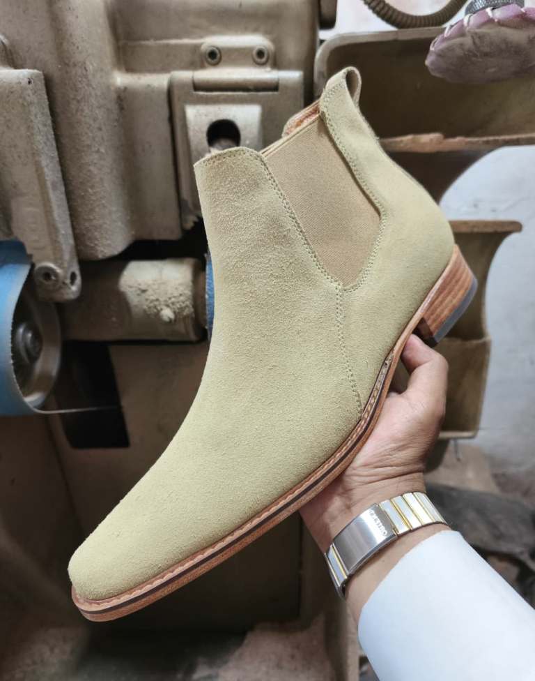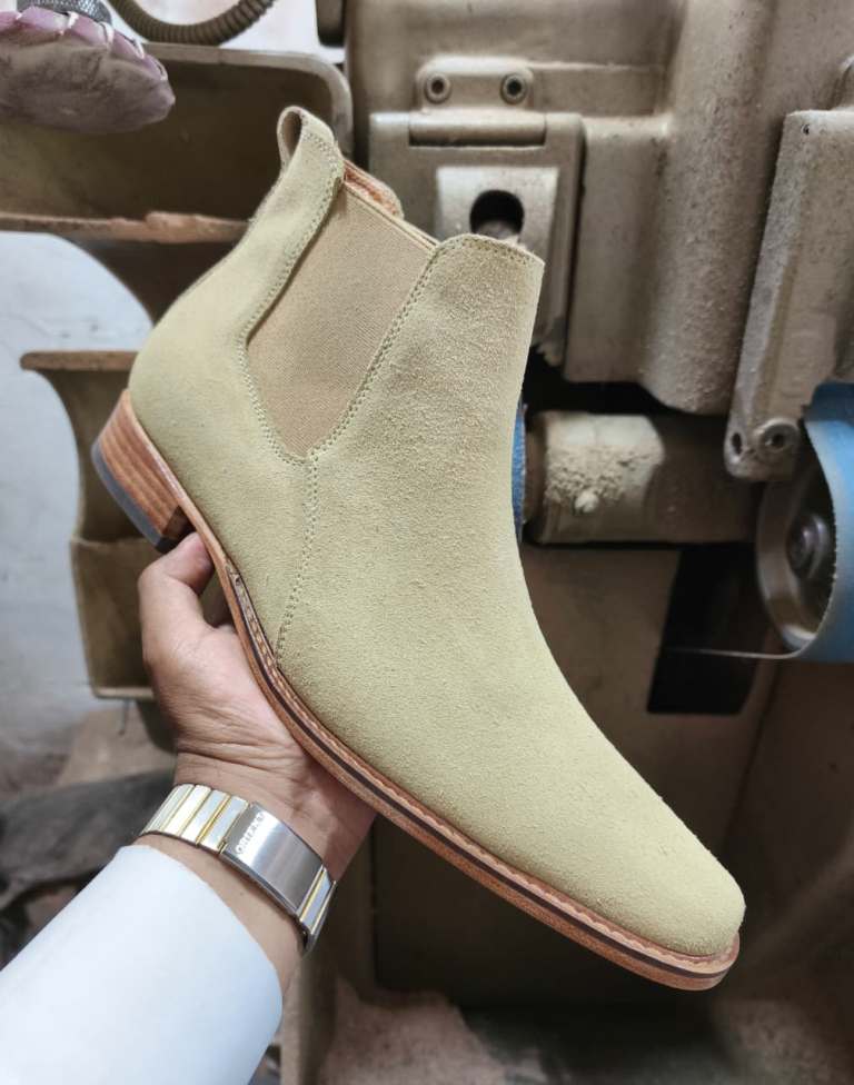 Chelsea Beat Arena MontaGo, elaborada en cuero carnaza tonalidad Arena. Diseño de vanguardia en horma original del estilo, piezas unidas por elástico de altísima resistencia a tono con la capellada, caña baja, forrada en cuero, plantilla blanda y suela elaborada en cuero “Material” más un cerco «contorno» en salpa Italiana para hacerla más gruesa, tacón de 2.5 cm.