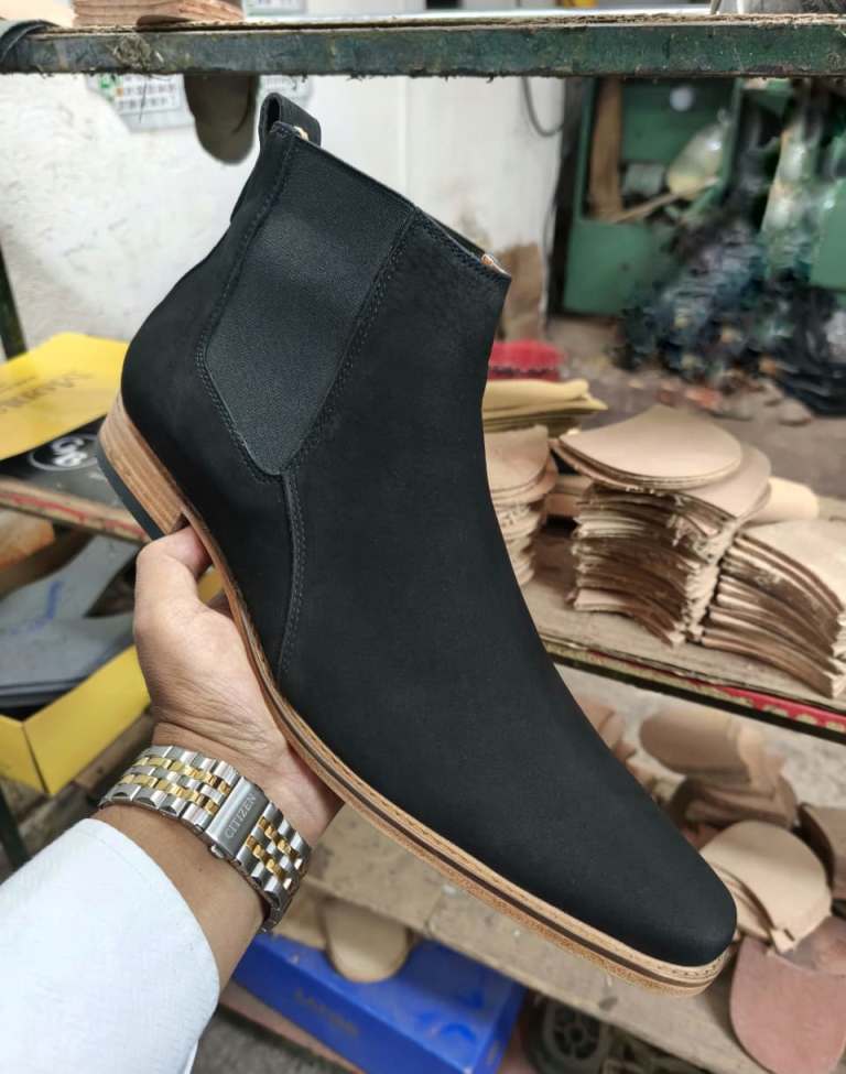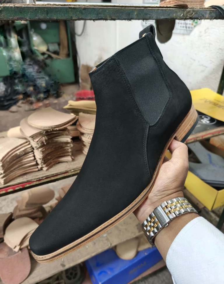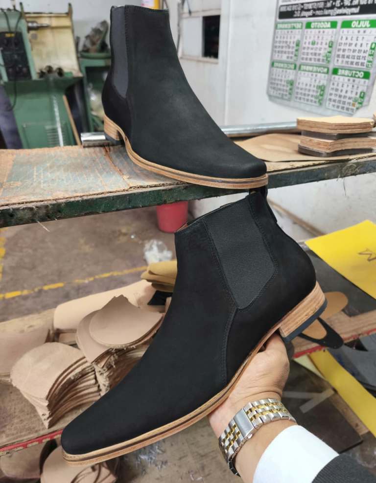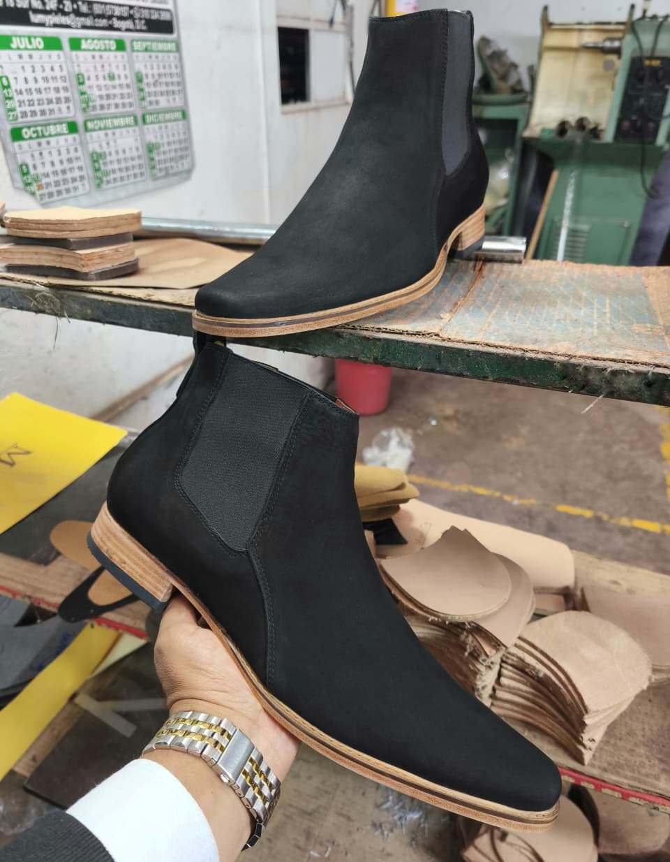 Chelsea Beat MontaGo, elaborada en cuero Nobuck negro, Diseño de vanguardia en horma original del estilo, piezas unidas por elástico de altísima resistencia, caña baja, forrada en cuero, plantilla blanda y suela elaborada en cuero “Material” más un cerco «contorno» en salpa Italiana para hacerla más gruesa, tacón de 2.5 cm.