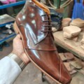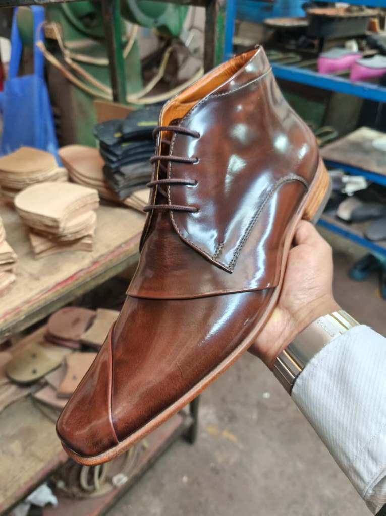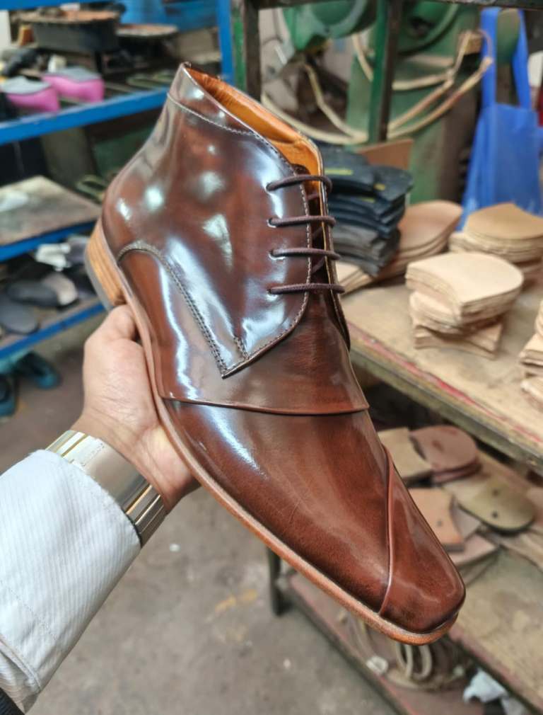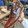 Botín MontaGo Giro Visos Café, elaborado en cuero de propiedades brillantes. Diseño con cortes cruzados unidos mediante costuras en técnica de cosido y vuelto . Empeine acordonado de 4 agujetas, forrado en cuero, plantilla blanda y suela elaborada en cuero “Material” con un tacón de 2.5 cm dando un estilo formal digno de un caballero.