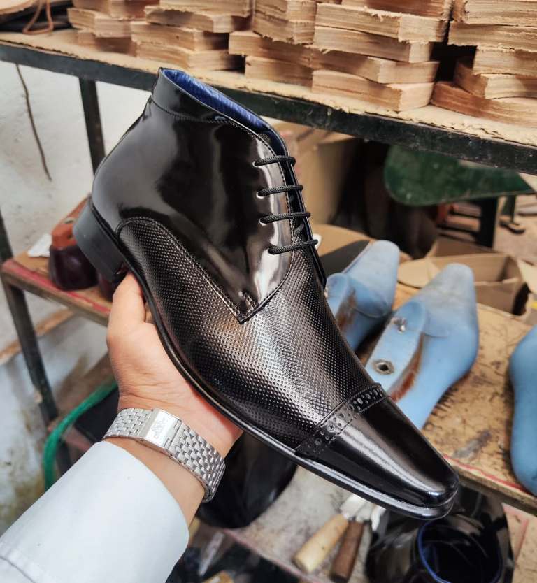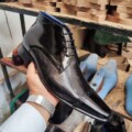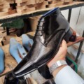 Botín Ravello MontaGo color Negro, elaborado en cuero. Diseño con perforaciones y cerco Italiano, Empeine acordonado, forrado en cuero, plantilla blanda y suela elaborada en cuero “Material” con un tacón de 2.5 cm dando un estilo formal digno de un caballero. Hecho por manos Colombianas